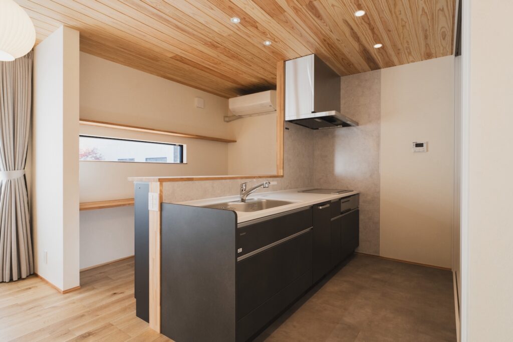 キッチンカウンターには重厚感のあるダークカラーを配し、天井の木目の美しさを引き立てています。 夜は、壁面を優しく照らす間接照明を灯すことで、昼間とはまた違ったホテルのようなラグジュアリーな雰囲気を楽しめます。