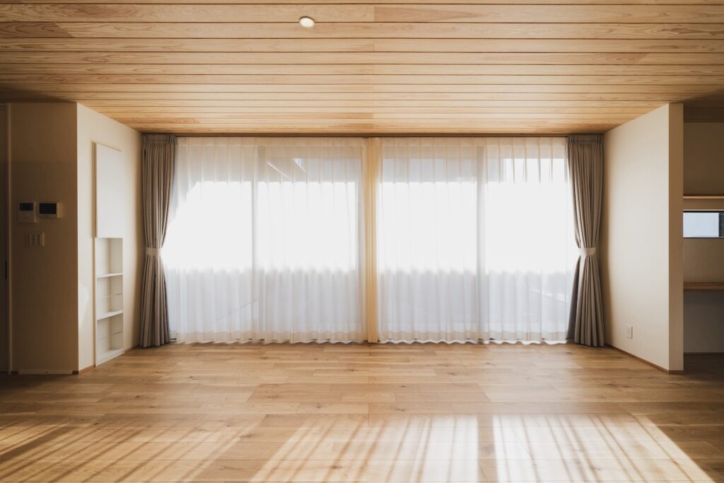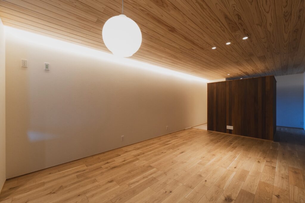 リビングに一歩入ると、視線は自然と上へと向かいます。 天井一面に施された「板張り天井」が、空間に圧倒的な奥行きと温もりを与えてくれます。
